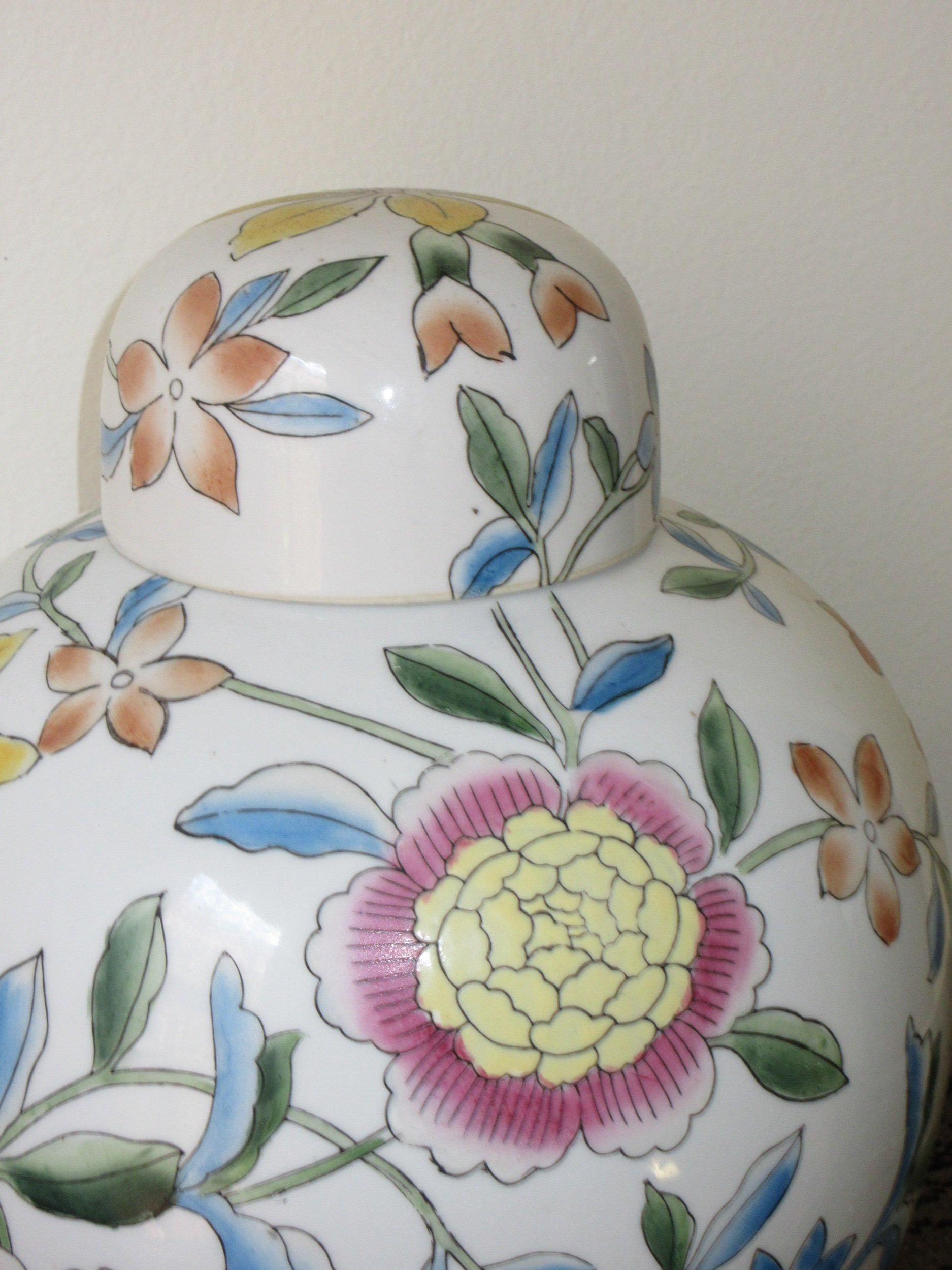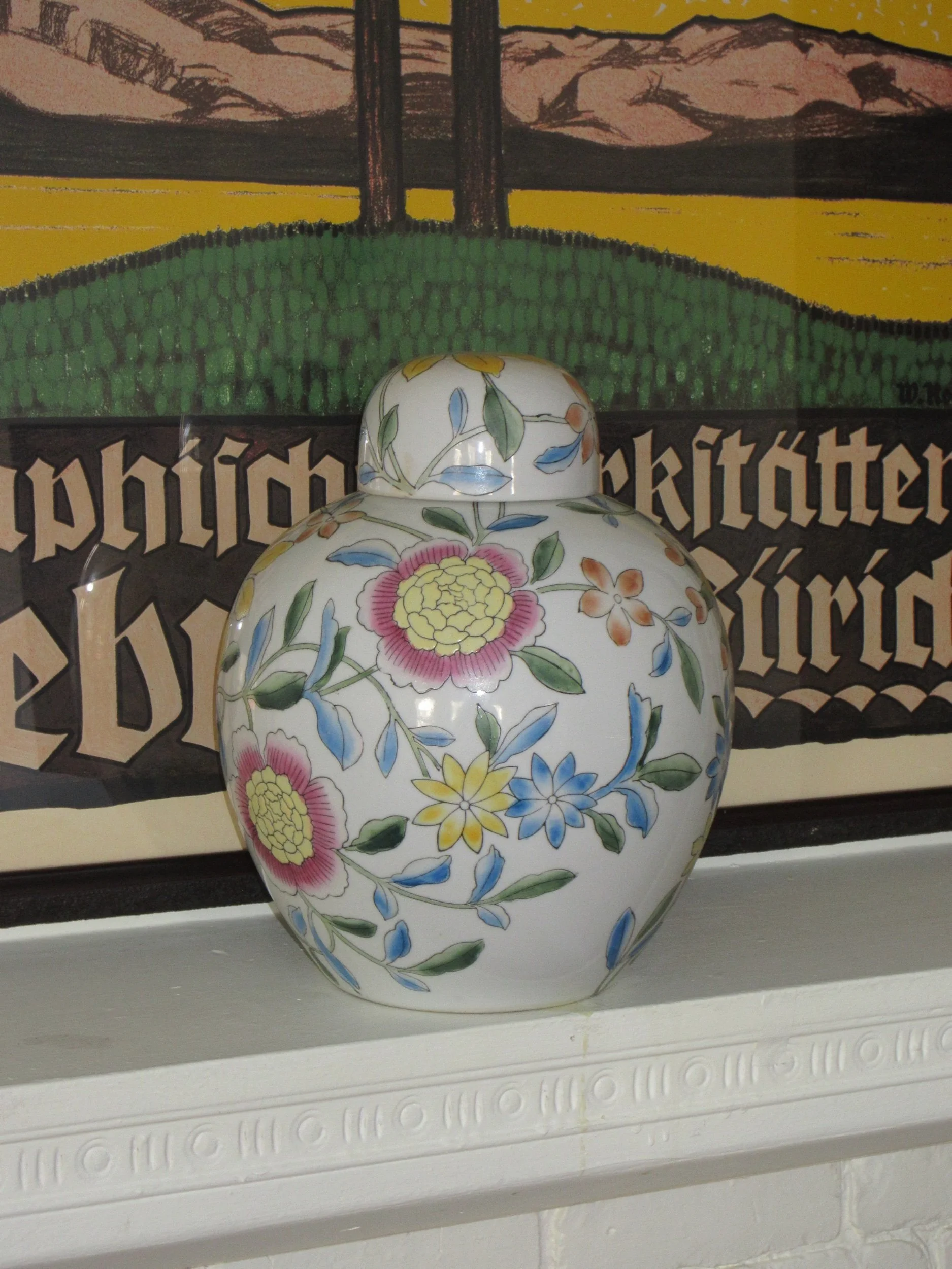 A classic hand-painted ginger jar covered in cheerful florals — soft blues, greens, yellows, and pinks. Such a charming piece for a mantel, entryway table, or bookshelf.
