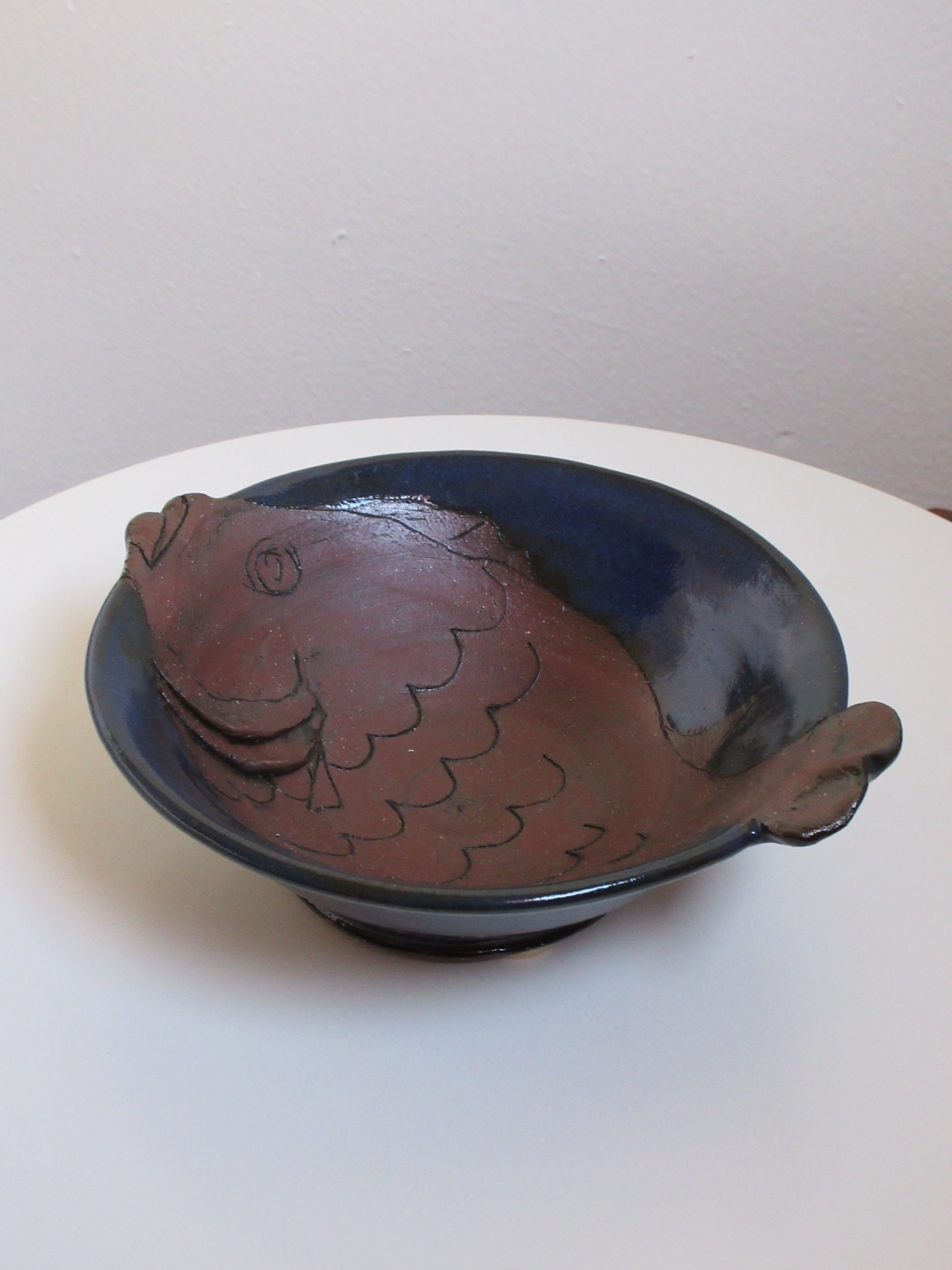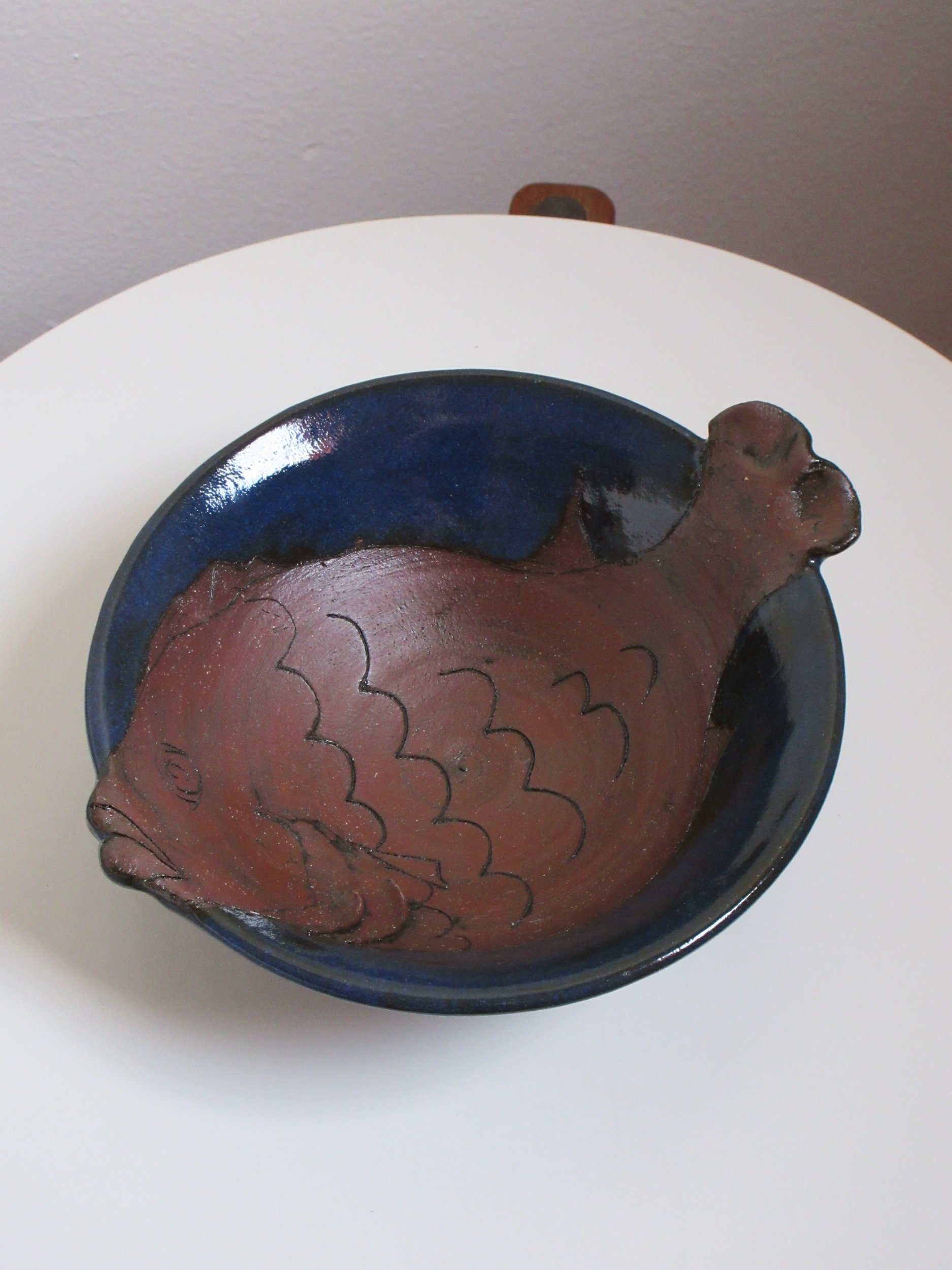 A one-of-a-kind handmade ceramic bowl featuring a sculptural fish form with carved detailing and a moody, layered glaze. Playful yet refined, this piece works beautifully as a statement object, fruit bowl, or standalone sculptural accent.
