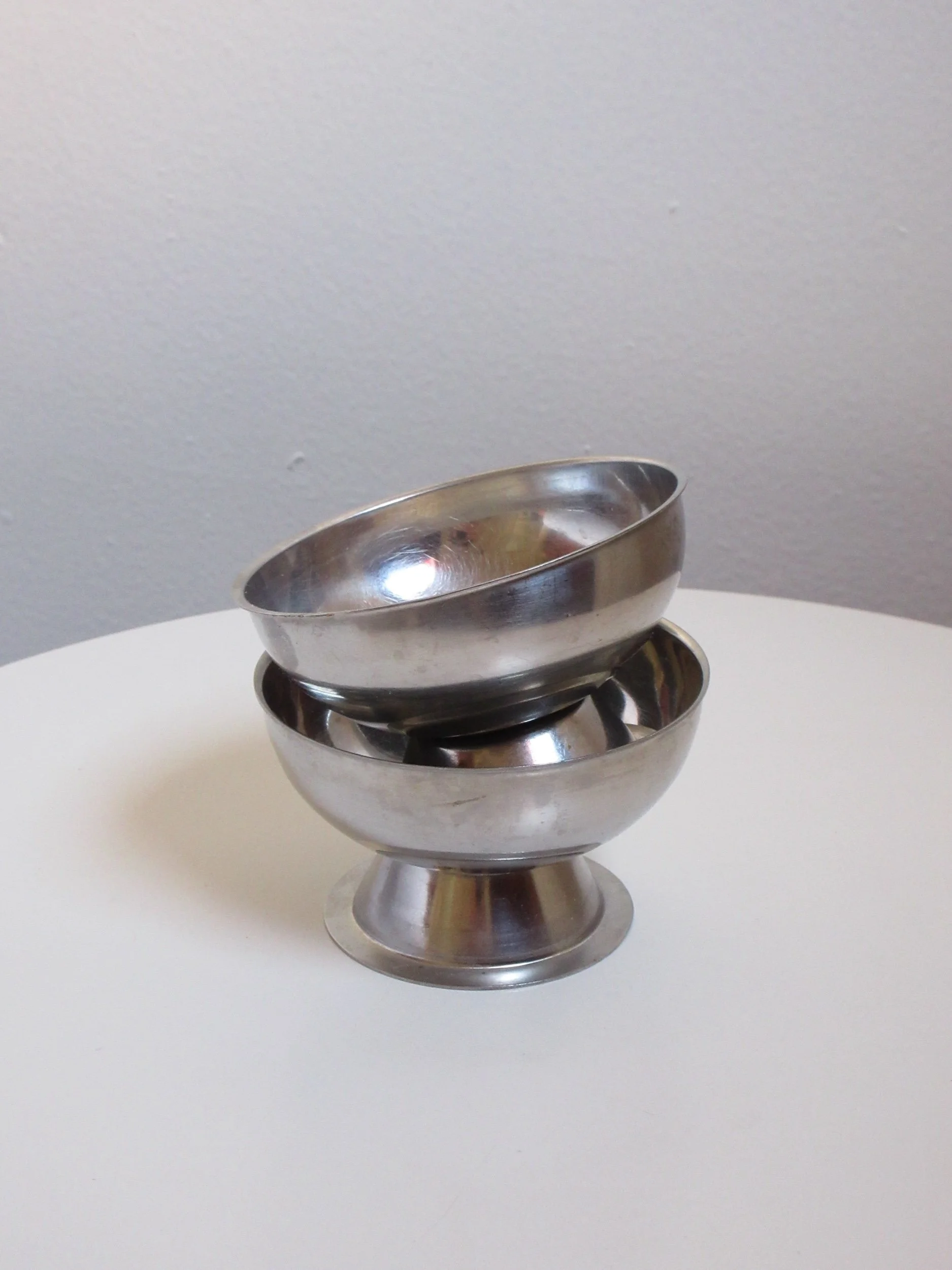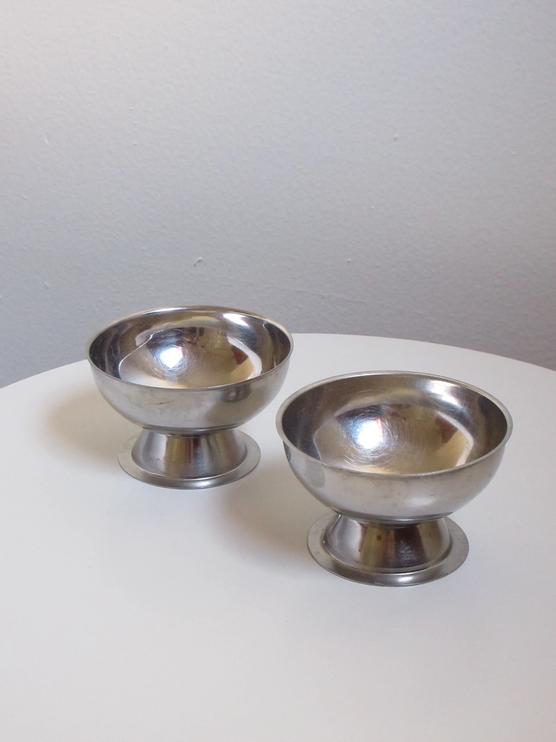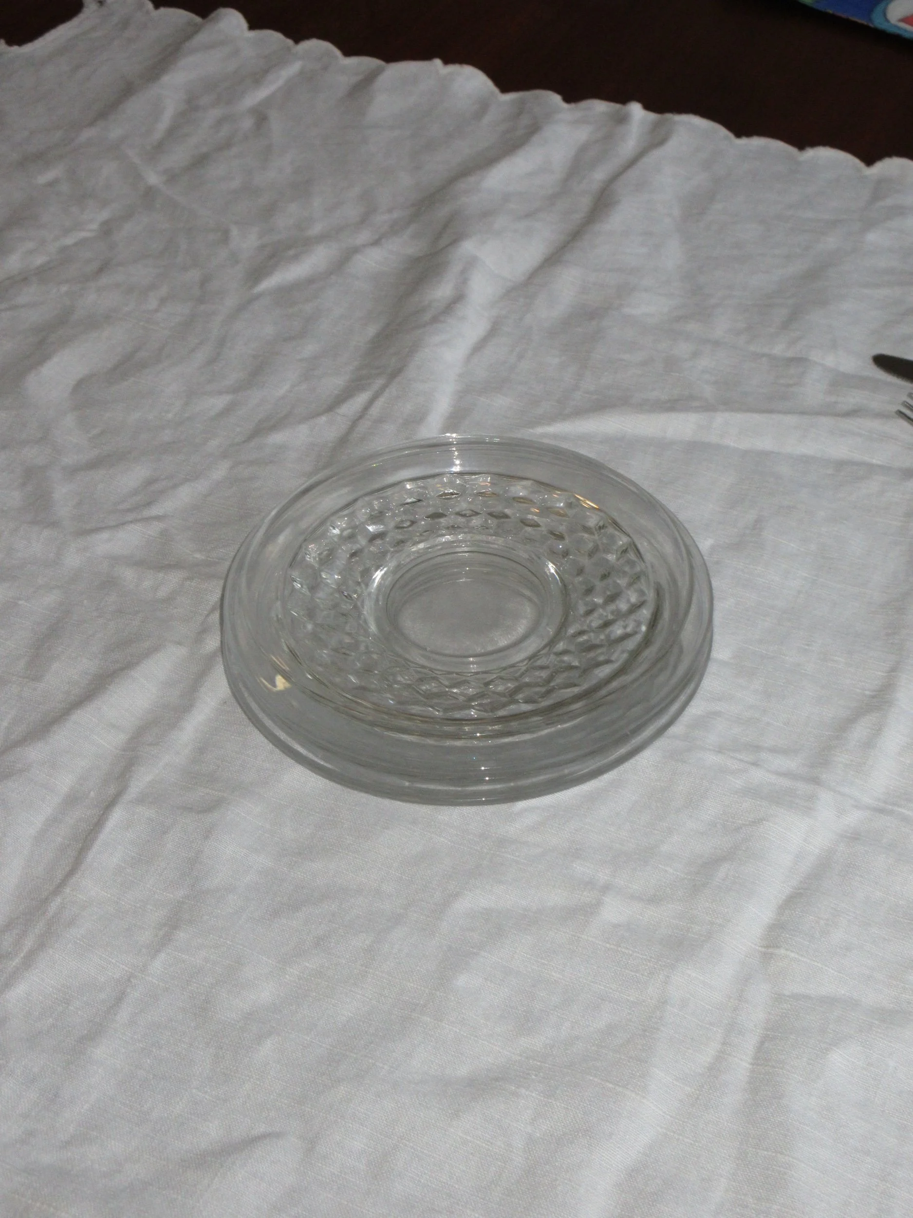 A sweet set of four vintage pressed-glass saucers featuring a light-catching honeycomb texture. Three measure 6.5” and one is 5.5”, giving the set that charming, collected feel. There is surface scratching throughout from age and use, but no chips or cracks. Perfect for small bites, under teacups, or as pretty little catchalls.