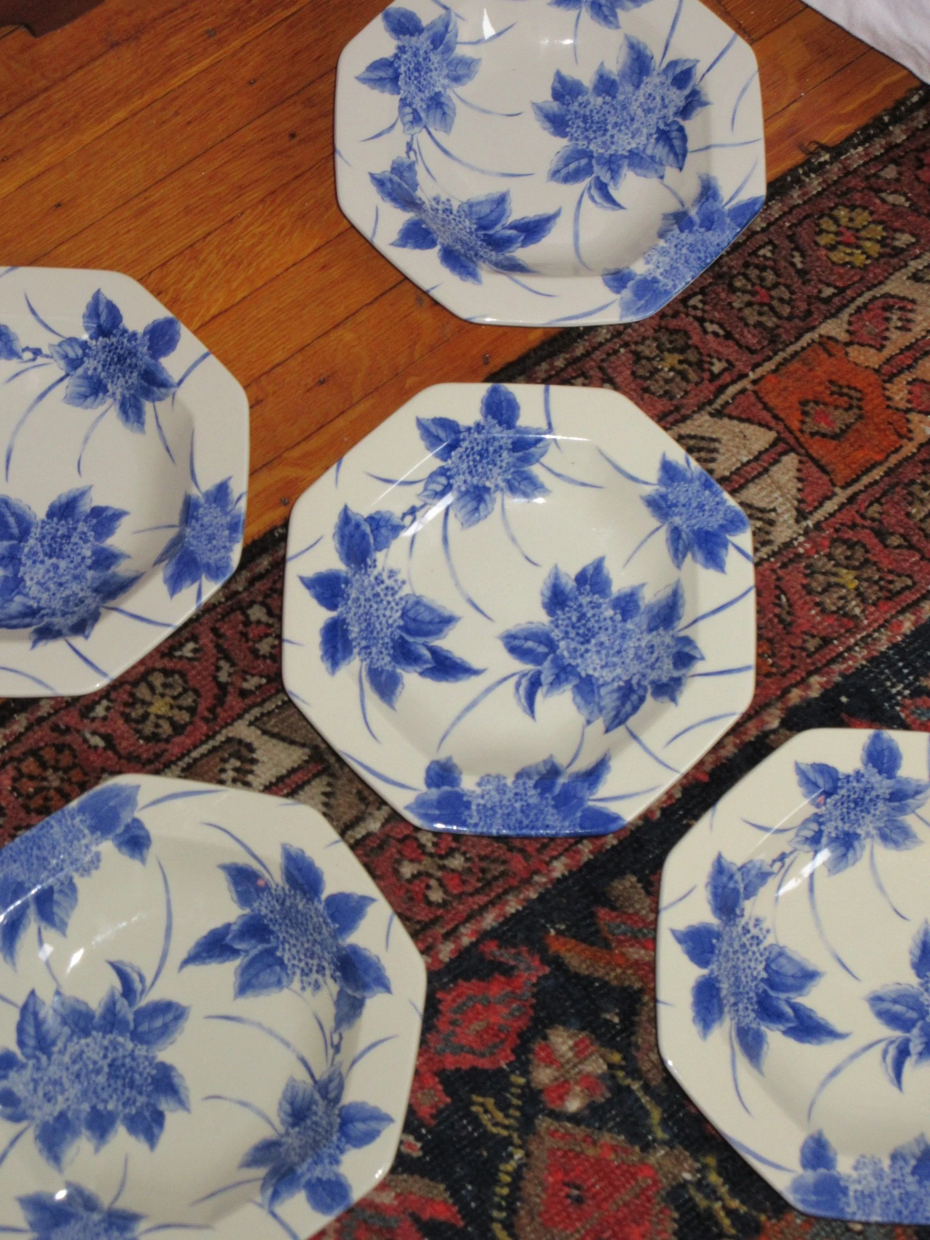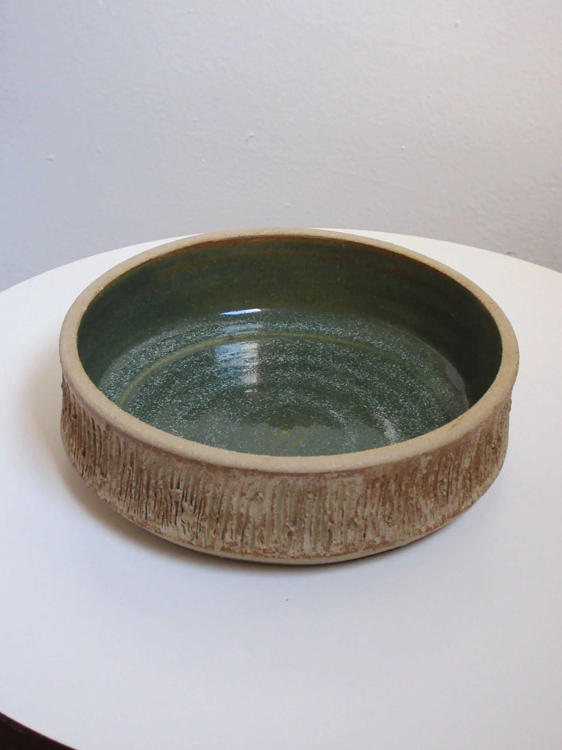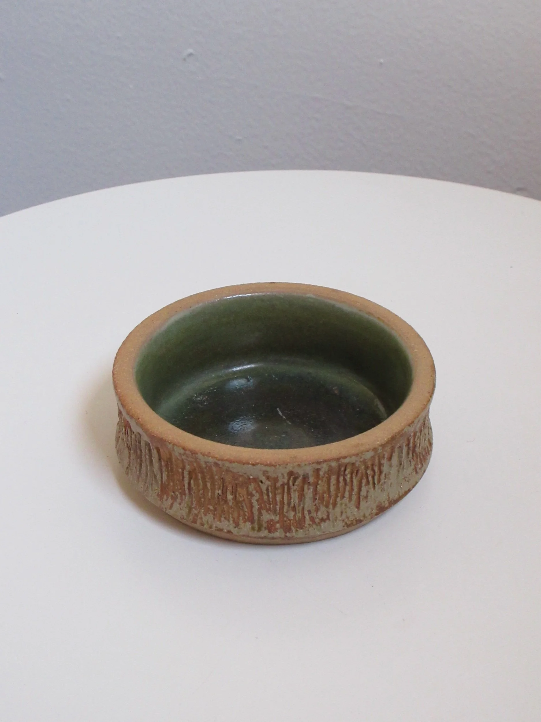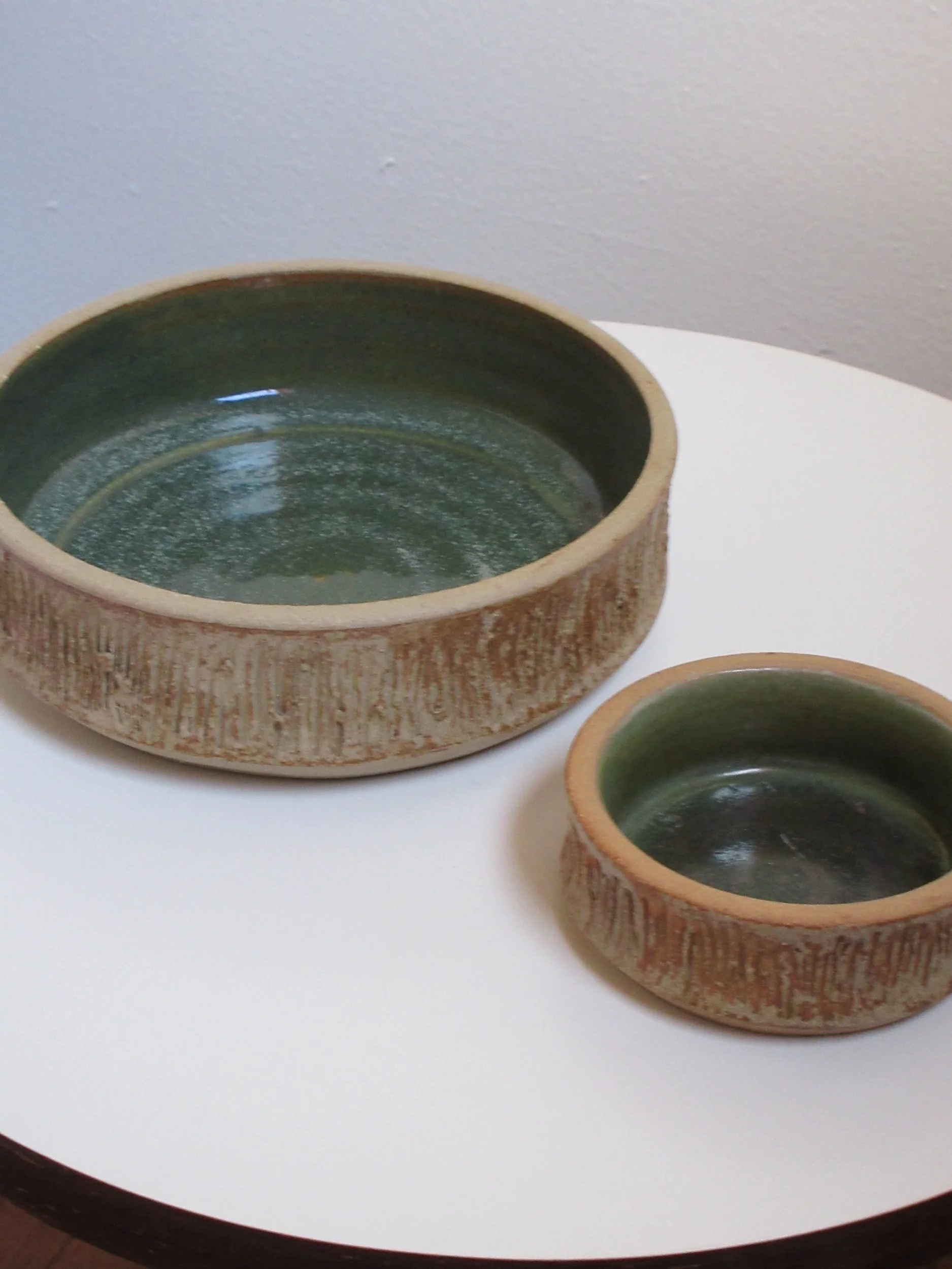 A sweet set of four vintage pressed-glass saucers featuring a light-catching honeycomb texture. Three measure 6.5” and one is 5.5”, giving the set that charming, collected feel. There is surface scratching throughout from age and use, but no chips or cracks. Perfect for small bites, under teacups, or as pretty little catchalls.